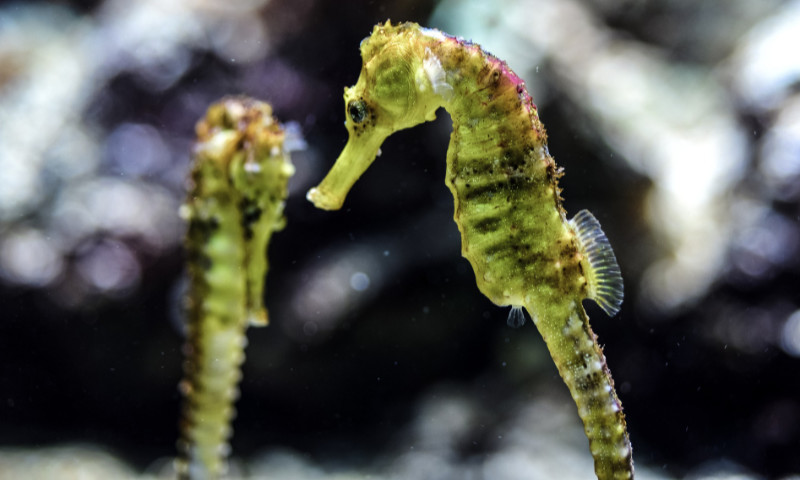 os pequenos cavalos-marinhos saem da bolsa do seu pai.