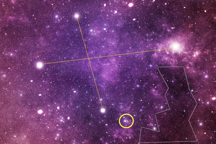 As quatro estrelas mais brilhantes formam uma cruz no céu. Uma nuvem escura perceptível pode ser vista ao sul sob a barra transversal esquerda.